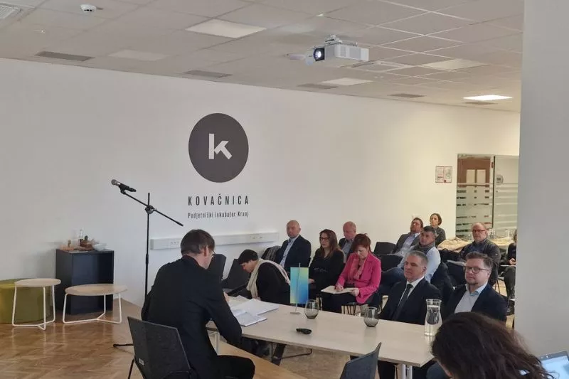 Kranj, 12. december 2023 - Predsednik Državnega sveta Marko Lotrič se je v podjetniškem inkubatorju Kranj udeležil sestanka RRA GIZ na temo Dogovor za razvoj regij.