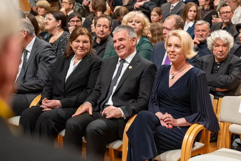 Ljubljana, 7. februar 2024 - Predsednik Državnega sveta Marko Lotrič s soprogo in sekretarka Državnega sveta mag. Monika Kirbiš Rojs so se udeležili osrednje obeležitve slovenskega kulturnega praznika, na kateri so bila slovesno podeljena najvišja priznanja Republike Slovenije za dosežke na področju umetnosti, dve Prešernovi nagradi in 6 nagrad Prešernovega sklada.