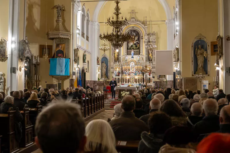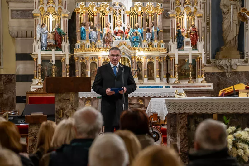 Škofja Loka, 8. december 2023 - Predsednik Državnega sveta Marko Lotrič je nagovoril zbrane na tradicionalnem novoletnem koncertu Škofja Loka, ki se je odvil v cerkvi Stara Loka.