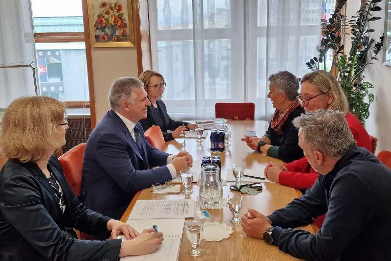 Ljubljana, 7. maj 2024 - Predsednik Državnega sveta RS Marko Lotrič, sekretarka DS dr. Monika Kirbiš Rojs in državna svetnica, vodja Interesne skupine delojemalcev Lidija Jerkič so se sestali s predsednico sindikalne skupine v Evropskem ekonomsko-socialnem odboru (EESC) Lucie Studnično in izvršnim direktorjem Zveze Svobodnih sindikatov Slovenije in članom Skupine delavcev v Evropskem ekonomsko-socialnem odboru Andrejem Zorkom.
